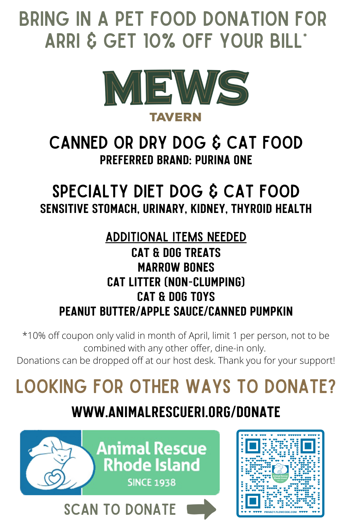 Bring in a pet food donation to the Mews to receive 10% off your bill when you dine-in with us!*