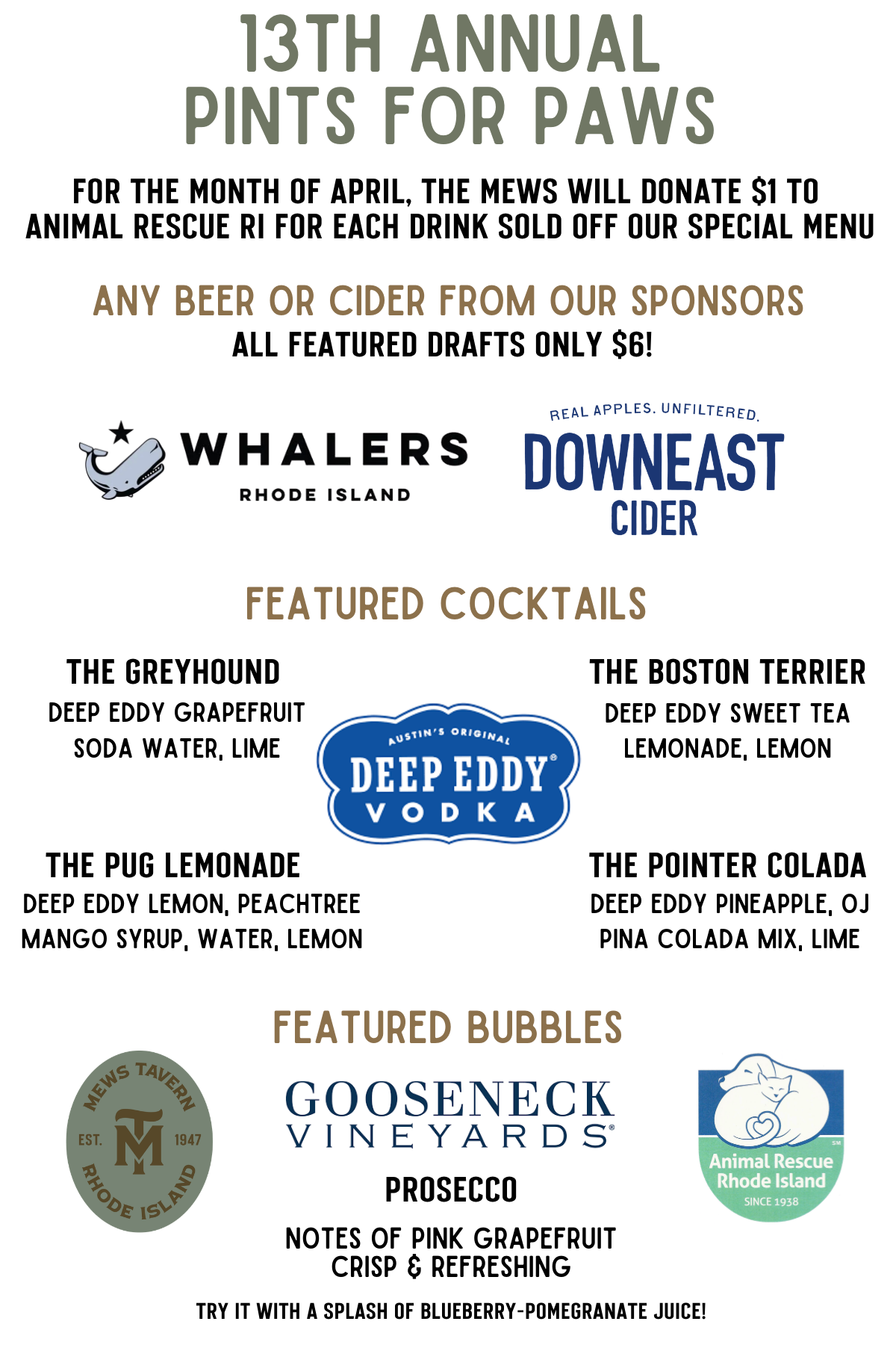 The Mews will donate $1 to Animal Rescue RI for every featured drink purchased in the month of April!
